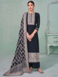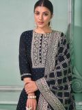 Renew your style statement with this black color straight cut kameez in georgette. Designed using zari and sequins work embroidery with stones all over. Paired with an embroidered georgette dupatta and a matching palazzo in shantoon. Note: Accessories shown are for styling purpose only. Slight color variation may occur due to photographic reasons. The semi-stitched kameez can be customised upto 42 inches.