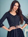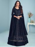 Presenting this navy blue color anarkali kameez in georgette. Designed using thread and sequins embroidery all over. Available with a matching georgette dupatta and a matching bottom in georgette. Note: Accessories shown are for styling purpose only. Slight color variation may occur due to photographic reasons. The semi-stitched kameez can be customised upto 42 inches.