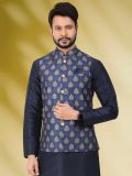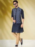Get set to look regal wearing this navy blue color kurta made in art silk. Comes with a blue color printed nehru jacket made in banarasi silk and beige color churidaar in art silk. Note: Some color variations may occur owing to photography causes. Up to 1 inch of measurement fluctuation is possible.