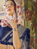 Walk like a queen wearing this navy blue color saree crafted in art silk. Augmented using zari woven patterns, showcasing distinstive borders and pallu. Available with a matching blue color blouse in art silk. Note: The accessories featured are purely for fashion purposes. Due to photography reasons, some color variations may occur. The un-stitched blouse may be customized up to 42 inches.