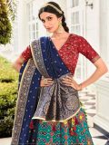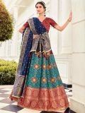 Get all dolled up wearing this blue color lehenga in banarasi silk. Augmented with traditional zari woven patterns. Comes with matching brown color banarasi silk choli and navy blue dupatta with similar weaves. Note: The accessories featured are purely for fashion purposes. Due to photography reasons, some color variations may occur. The semi-stitched choli and lehenga waist may be customized up to 42 inches.