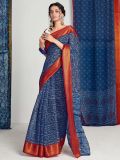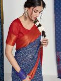Look elegant as you wear this navy blue color saree in jacquard. Enhanced using printed patterns, showcasing distinstive borders enhanced with zari weaves. Paired with a matching red color blouse in jacquard. Note: The accessories featured are purely for fashion purposes. Due to photography reasons, some color variations may occur. The un-stitched blouse may be customized up to 42 inches.