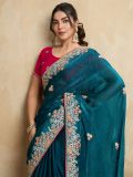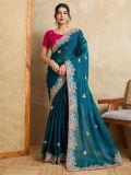 Adorning yourself in the poetry wearing this blue color saree crafted in chiffon. Furnished using sequins and floral thread work embroidered borders. Comes with a bright red color blouse in art silk. Note: The accessories featured are purely for fashion purposes. Due to photography reasons, some color variations may occur. The un-stitched blouse may be customized up to 42 inches.