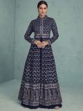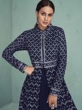 Get set to look regal adorning this navy blue color jacketed kameez in georgette. Decorated using zari and thread work embroidery with stones all over. Paired with a matching chiffon dupatta and a matching bottom in shantoon. Note: Accessories shown are for styling purpose only. Slight color variation may occur due to photographic reasons. The semi-stitched kameez can be customised upto 42 inches.