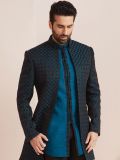 Mark your appearance adorning this blue color indo western made in silk. Decorated using thread embroidery work all over. Paired with black color trouser in silk and a matching blue kurta underneath. Note: Some color variations may occur owing to photography causes. Up to 1 inch of measurement fluctuation is possible.