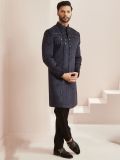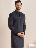 Get your hands on this pigeon blue color indo western made in velvet. Augmented using thread embroidered work. Comes with black color trouser in silk. Note: Some color variations may occur owing to photography causes. Up to 1 inch of measurement fluctuation is possible.