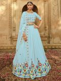Mark a swoon-worthy statement wearing this baby blue hued lehenga in georgette. Decorated with floral themes sequins and thread embroidered work. Paired with a matching blue color choli in georgette and a blue georgette dupatta, both embellished in similar work. Please keep in mind that the accessories featured are purely for fashion purposes. Due to photography reasons, some color variations may occur. The semi-stitched choli and lehenga waist may be customized up to 42 inches.