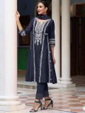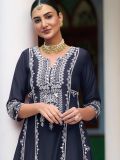 Overwhelm the audience adorning this denim blue color flared kameez in art silk. Designed using mirror work and thread embroidery all over. Paired with a blue organza dupatta and matching pants in art silk. Note: Accessories shown are for styling purpose only. Slight color variation may occur due to photographic reasons. The semi-stitched kameez can be customised upto 42 inches.