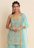 Enhance your festive look adorning this baby blue color sharara suit in georgette. Elevated using thread embroidery all over. Available with a matching laced net dupatta and a matching bottom in georgette. Note: Accessories shown are for styling purpose only. Slight color variation may occur due to photographic reasons. The semi-stitched kameez can be customised upto 42 inches.