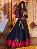Amp up your festive look wearing this navy blue hued festive lehenga in silk. Decorated with colorful thread embroidery, creating a dramatic hemline. Paired with a contrast matching blue color choli in silk and a yellow colored silk dupatta, both designed with similar embroidered work. Please keep in mind that the accessories featured are purely for fashion purposes. Due to photography reasons, some color variations may occur. The semi-stitched choli and lehenga waist may be customized up to 42 inches.