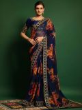 Spread cheer with this berry blue color saree crafted in georgette. Augmented using floral printed patterns, showcasing distinstive borders enhanced with zari and sequins embroidery. Comes with an embroidered blue color blouse in georgette. Note: The accessories featured are purely for fashion purposes. Due to photography reasons, some color variations may occur. The un-stitched blouse may be customized up to 42 inches.