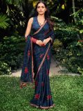 Look no less than a dream adorning this dark blue color saree crafted in chiffon. Elevated using digital floral patterns and foil printed patterns, showcasing distinstive borders. Comes with a matching blue color printed blouse in chiffon. Note: The accessories featured are purely for fashion purposes. Due to photography reasons, some color variations may occur. The un-stitched blouse may be customized up to 42 inches.