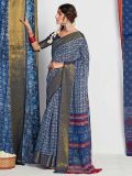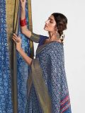 Upgrade your casual wardrobe with this deep blue color saree in jacquard. Elevated using printed patterns, showcasing distinstive borders enhanced with zari weaves. Teamed with a matching blue color blouse in jacquard. Note: The accessories featured are purely for fashion purposes. Due to photography reasons, some color variations may occur. The un-stitched blouse may be customized up to 42 inches.
