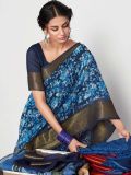Allure the crowd adorning this blue color saree in jacquard. Furnished using floral printed patterns, showcasing distinstive borders enhanced with zari weaves. Available with a matching blue color blouse in jacquard. Note: The accessories featured are purely for fashion purposes. Due to photography reasons, some color variations may occur. The un-stitched blouse may be customized up to 42 inches.