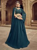 Elegance and beauty come together this teal blue color pleated lehenga in georgette. Elevated with sequin, stone with thread work heavy embroidery. Comes with a matching blue color embroidered choli with feather style jointed sleeves in georgette. Note: The accessories featured are purely for fashion purposes. Due to photography reasons, some color variations may occur. The semi-stitched choli and lehenga waist may be customized up to 42 inches.