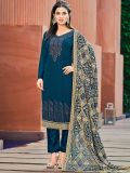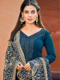 Grace up your appearance adorning this prussian blue color straight cut kameez in georgette. Crafted using stones work all over. Paired with blue georgette dupatta drenched in thread work and a matching pant in shantoon. Note: Accessories shown are for styling purpose only. Slight color variation may occur due to photographic reasons. The semi-stitched kameez can be customised upto 42 inches.