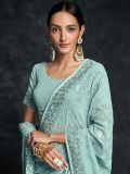 Evoke the diva in you wearing this sky blue color saree crafted in georgette. Enhanced using sequins, thread embroidered patterns with stone embellisgments all over. Comes with a matching blue color blouse in georgette. Note: The accessories featured are purely for fashion purposes. Due to photography reasons, some color variations may occur. The un-stitched blouse may be customized up to 42 inches.