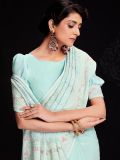 Be the best dressed diva adorning this light blue color saree in georgette. Designed using sequins, chikankari embroidered patterns, showcasing distinstive borders. Available with a matching blue color blouse in georgette. Note: The accessories featured are purely for fashion purposes. Due to photography reasons, some color variations may occur. The un-stitched blouse may be customized up to 42 inches.