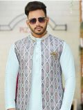 Get your hands on this sky blue color kurta made in jacquard. Topped with a printed jacquard nehru jacket in grey. Comes with a white color trouser pants in cotton. Note: Some color variations may occur owing to photography causes. Up to 1 inch of measurement fluctuation is possible.
