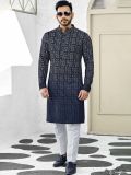 Get a stylish festive look adorning this blue color full sleeved kurta made in jacquard. Augmented with dense printed details. Assembled with white color trousers in silk. Note: Some color variations may occur owing to photography causes. Up to 1 inch of measurement fluctuation is possible.
