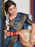 Keep your festive looks easy with this navy blue color saree in jacquard. Crafted using printed patterns, showcasing distinstive borders enhanced with zari weaves. Comes with a matching blue color blouse in jacquard. Note: The accessories featured are purely for fashion purposes. Due to photography reasons, some color variations may occur. The un-stitched blouse may be customized up to 42 inches.
