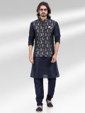 Shine all day sporting this navy blue color kurta made in art silk. Styled using jacquard woven banarasi silk jacket in blue shade. Comes with matching blue color churidaar in art silk. Note: Some color variations may occur owing to photography causes. Up to 1 inch of measurement fluctuation is possible.
