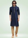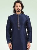 Exude royal vibes with this navy blue color men's kurta made in banarasi silk. Decorated using thread embroidered details all over. Teamed with matching beige color churidar pants in art silk. Note: Some color variations may occur owing to photography causes. Up to 1 inch of measurement fluctuation is possible.