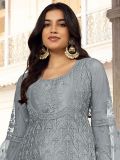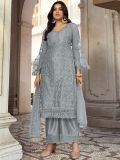 Make a flawless ethnic look adorning this pigeon blue color straight cut kameez in net. Decorated using fine thread work embroidery with stones all over. Paired with a matching net dupatta and a matching palazzo in net with satin linings. Note: Accessories shown are for styling purpose only. Slight color variation may occur due to photographic reasons. The semi-stitched kameez can be customised upto 42 inches.