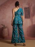 Invigorate your wardrobe by adding this blue color one hand sleeved flare style top made in pure muslin silk. Furnished with floral printed pattern all over. Available with matching blue color bell bottom style pant made in muslin silk. Note: Some color variations may occur owing to photography causes. Up to 1 inch of measurement fluctuation is possible.