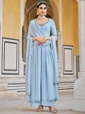 Glam up sweetly adorning this powder blue color anarkali kameez in georgette. Crafted using sequins and thread, mirror work embroidery all over. Paired with a blue dupatta and a palazzo, both made in georgette. Note: Accessories shown are for styling purpose only. Slight color variation may occur due to photographic reasons. The semi-stitched kameez can be customised upto 42 inches.