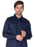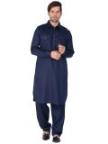 Look all stylish and glam adorning this navy blue color kurta made in cotton. Crafted with coller pattern and patch pockets. Teamed with a blue color pathani salwar in cotton. Note: Some color variations may occur owing to photography causes. Up to 1 inch of measurement fluctuation is possible.