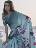 Walk the glam adorning this sky blue shaded saree crafted in satin. Furnished with floral digital printed patterns all over. Comes with a matching blouse in satin. Note: The accessories featured are purely for fashion purposes. Due to photography reasons, some color variations may occur. The un-stitched blouse may be customized up to 42 inches.