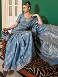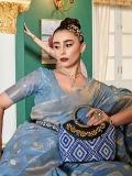 Sit like a queen as you wear this pigeon blue color saree crafted in art silk. Augmented using zari woven patterns all over, showcasing distinstive borders and pallu. Comes with a matching blue color blouse in art silk. Note: The accessories featured are purely for fashion purposes. Due to photography reasons, some color variations may occur. The un-stitched blouse may be customized up to 42 inches.