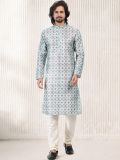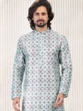 Presenting this sky blue color kurta made in banarasi silk. Elevated with a printed details all over, with potli buttons along the placket. Teamed with a white color churidar pants in art silk. Note: Some color variations may occur owing to photography causes. Up to 1 inch of measurement fluctuation is possible.