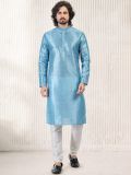 Grab all the attention adorning this cerulean blue color kurta made in banarasi silk. Furnished with a printed details all over, with potli buttons along the placket. Comes with a white color churidar pants in art silk. Note: Some color variations may occur owing to photography causes. Up to 1 inch of measurement fluctuation is possible.