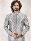 Get set to look handsome adorning this sapphire blue color kurta made in banarasi silk. Decked with a printed details all over, with potli buttons along the placket. Comes with a matching blue color churidar pants in art silk. Note: Some color variations may occur owing to photography causes. Up to 1 inch of measurement fluctuation is possible.
