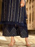 Exude regal vibes adorning this navy blue color straight cut kameez in georgette. Enhanced using sequins and thread embroidery all over. Comes with a matching chiffon dupatta and a matching bottom in shantoon. Note: Accessories shown are for styling purpose only. Slight color variation may occur due to photographic reasons. The semi-stitched kameez can be customised upto 42 inches.