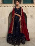 Stand apart from the crowd wearing this dark blue color anarkali kameez in georgette. Enhanced using sequins and thread work embroidery all over. Teamed with a maroon color embroidered dupatta in georgette. Note: Accessories shown are for styling purpose only. Slight color variation may occur due to photographic reasons. The semi-stitched kameez can be customised upto 42 inches. The suit does not come with a bottom.