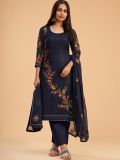 Make a flawless ethnic look adorning this denim blue color straight cut kameez in georgette. Enhanced using sequins and thread work embroidery all over. Assembled with a blue color matching georgette dupatta and matching pants in shantoon. Note: Accessories shown are for styling purpose only. Slight color variation may occur due to photographic reasons. The semi-stitched kameez can be customised upto 42 inches.