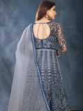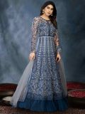 Exude dreamy vibes adorning this blue color abaya style anarkali kameez in net. Crafted using thread embroidery all over. Comes with a matching net dupatta and bottom in shantoon. Note: Accessories shown are for styling purpose only. Slight color variation may occur due to photographic reasons. The semi-stitched kameez can be customised upto 42 inches.
