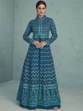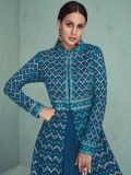 Look no less than a dream adorning this cobalt blue color jacketed kameez in georgette. Augmented using zari and thread work embroidery with stones all over. Assembled with a matching chiffon dupatta and a matching bottom in shantoon. Note: Accessories shown are for styling purpose only. Slight color variation may occur due to photographic reasons. The semi-stitched kameez can be customised upto 42 inches.