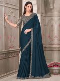 Look no less than a dream wearing this dark teal blue color saree crafted in georgette silk. Augmented using sequins embellishment with floral zari work embroidered borders with tassels. Comes with a grey color embroidered blouse in tussar silk. Note: The accessories featured are purely for fashion purposes. Due to photography reasons, some color variations may occur. The un-stitched blouse may be customized up to 42 inches.