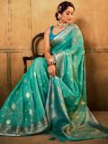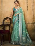 Feel your relaxed aura wearing this sky blue color saree in tissue. Enhanced with dainty zari woven patterns. Comes with a matching woven blouse made in tissue. Note: Accessories shown are for styling purpose only. Slight color variation may occur due to photographic reasons. The un-stitched blouse can be customised upto 42 inches.
