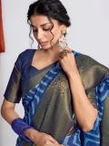 Walk in style adorning this navy blue color saree in jacquard. Augmented using zig-zag printed patterns, displaying distinstive borders enhanced with zari weaves. Comes with a matching blue color blouse in jacquard. Note: The accessories featured are purely for fashion purposes. Due to photography reasons, some color variations may occur. The un-stitched blouse may be customized up to 42 inches.