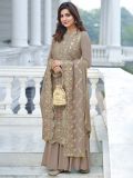 Walk with ease adorning this Brown color straight cut kameez in georgette. Furnished with sequins, thread embroidery and mirror work all over. Assembled with a matching embroidered georgette dupatta and a palazzo in shantoon. Note: Accessories shown are for styling purpose only. Slight color variation may occur due to photographic reasons. The semi-stitched kameez can be customised upto 42 inches.