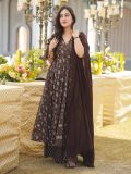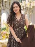 Show your feminine side to the world wearing this dark brown color readymade anarkali style kameez in muslin. Augmented using digital printed all over. Comes with a georgette dupatta and a palazzo style bottom, both made in brown color. Note: Accessories shown are for styling purpose only. Slight color variation may occur due to photographic reasons.