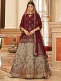 Grab all the compliments wearing this tortilla brown hued festive lehenga in chiffon. Designed with sparkly sequins and thread embroidery, creating a dramatic hemline. Comes along with a contrast matching maroon color kurti style choli in chiffon and a maroon colored net dupatta, both embroidered with similar work. Please keep in mind that the accessories featured are purely for fashion purposes. Due to photography reasons, some color variations may occur. The semi-stitched choli and lehenga waist may be customized up to 42 inches.