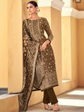 Look elegant adorning this coffee brown color straight cut kameez in velvet. Furnished with floral digital prints all over and stones work. Available with a matching printed pashmina dupatta and velvet pants. Note: Accessories shown are for styling purpose only. Slight color variation may occur due to photographic reasons. The semi-stitched kameez can be customised upto 42 inches.
