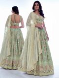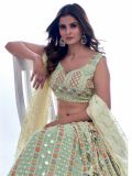 Overwhelm the audience as you wear this light green color lehenga in georgette. Augmented with sequins and thread embroidered work. Paired with a matching green color embroidered choli and off-white dupatta, both made in georgette. Note: The accessories featured are purely for fashion purposes. Due to photography reasons, some color variations may occur. The semi-stitched choli and lehenga waist may be customized up to 42 inches.