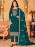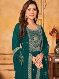 Showcasing this ocean green color straight cut kameez in georgette. Designed using sequins and dori embroidery all over. Paired with an embroidered georgette dupatta and a matching bottom in shantoon. Note: Accessories shown are for styling purpose only. Slight color variation may occur due to photographic reasons. The semi-stitched kameez can be customised upto 42 inches.